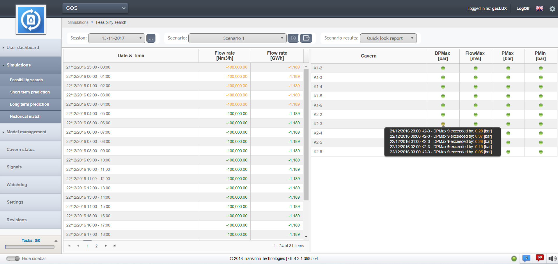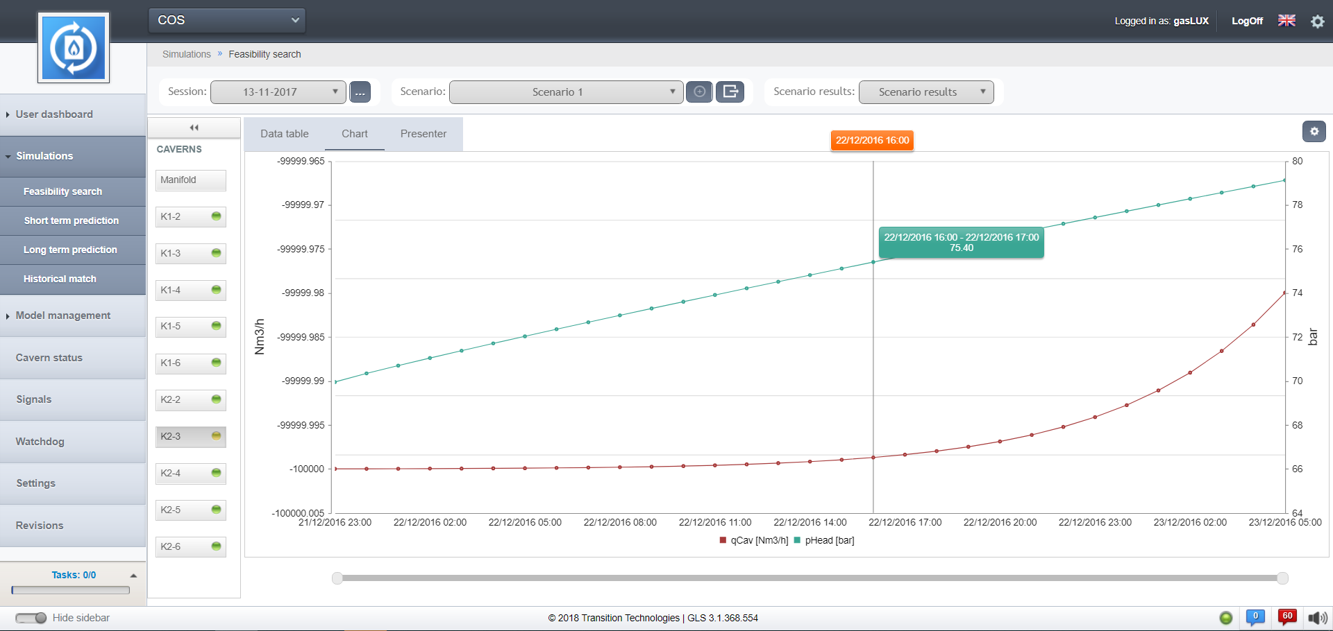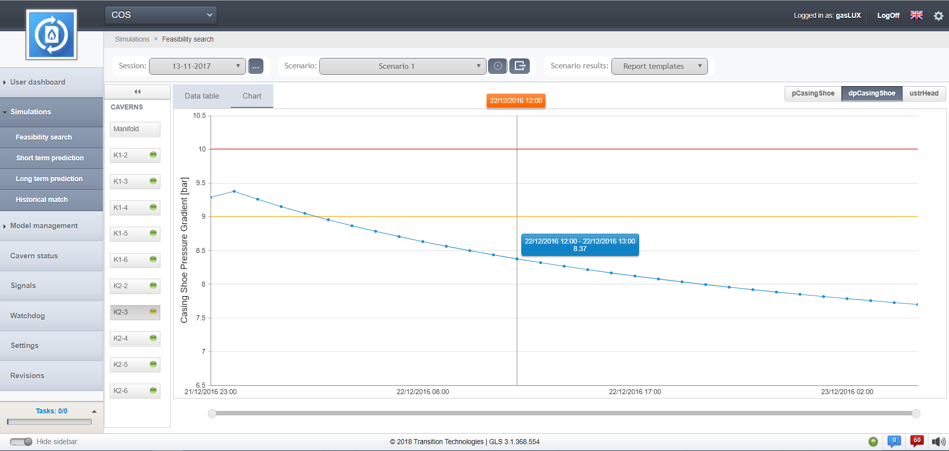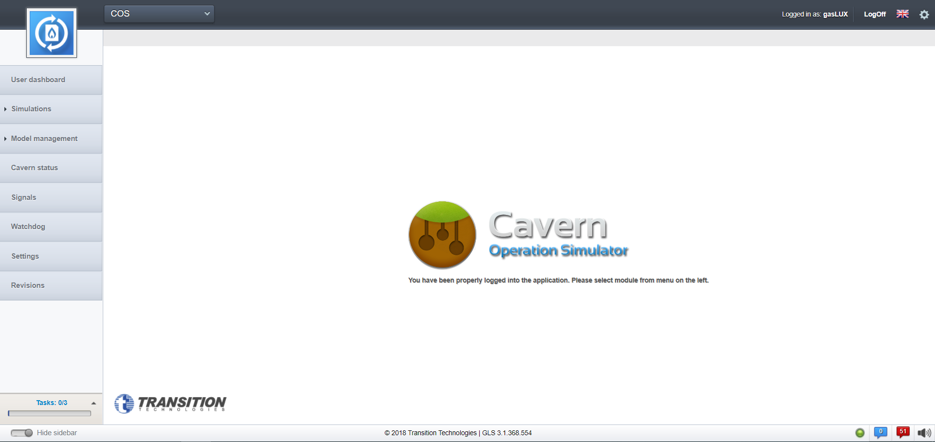 Symulator COS wspiera procesy związane z prognozowaniem dostępności kawern, Głównym celem i zaletą aplikacji jest umożliwienie użytkownikom przeprowadzenia wielu operacyjnych symulacji w ciągu dnia. Mogą one być realizowane dla znanych nominacji lub do weryfikacji możliwości magazynu w przypadku nowych zamówień na produkty magazynowe. COS integruje w pełni model instalacji podziemnej z bieżącymi pomiarami pozyskiwanymi głównie z systemów automatyki.