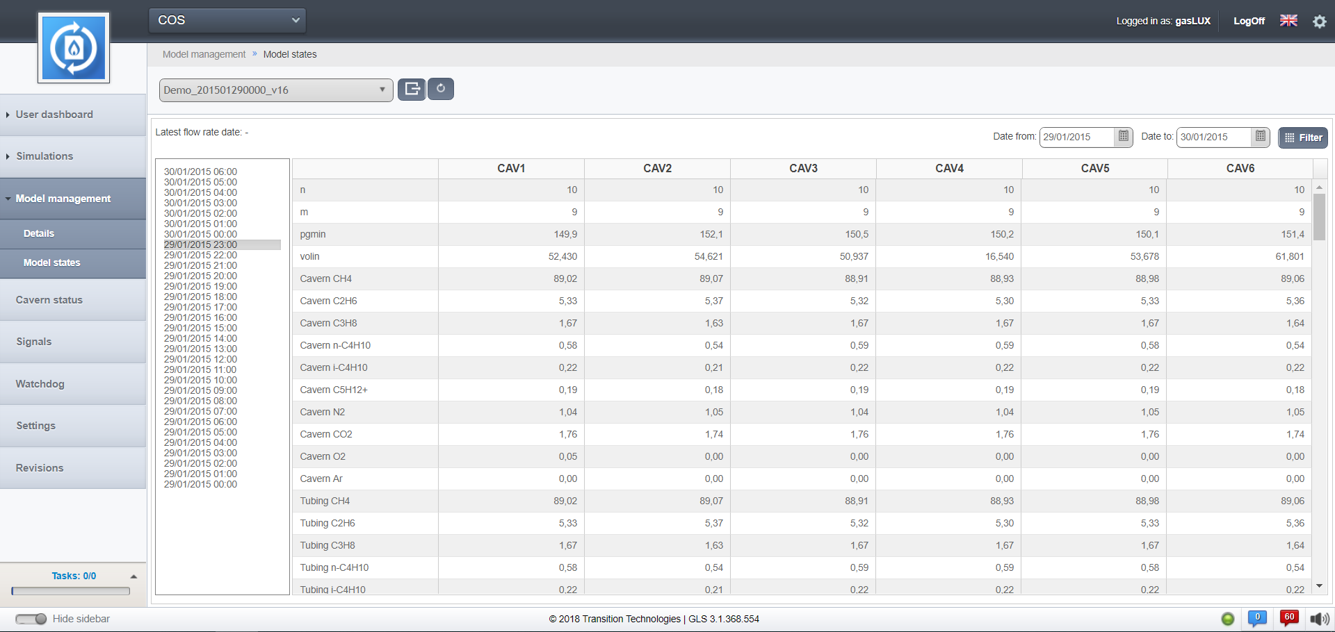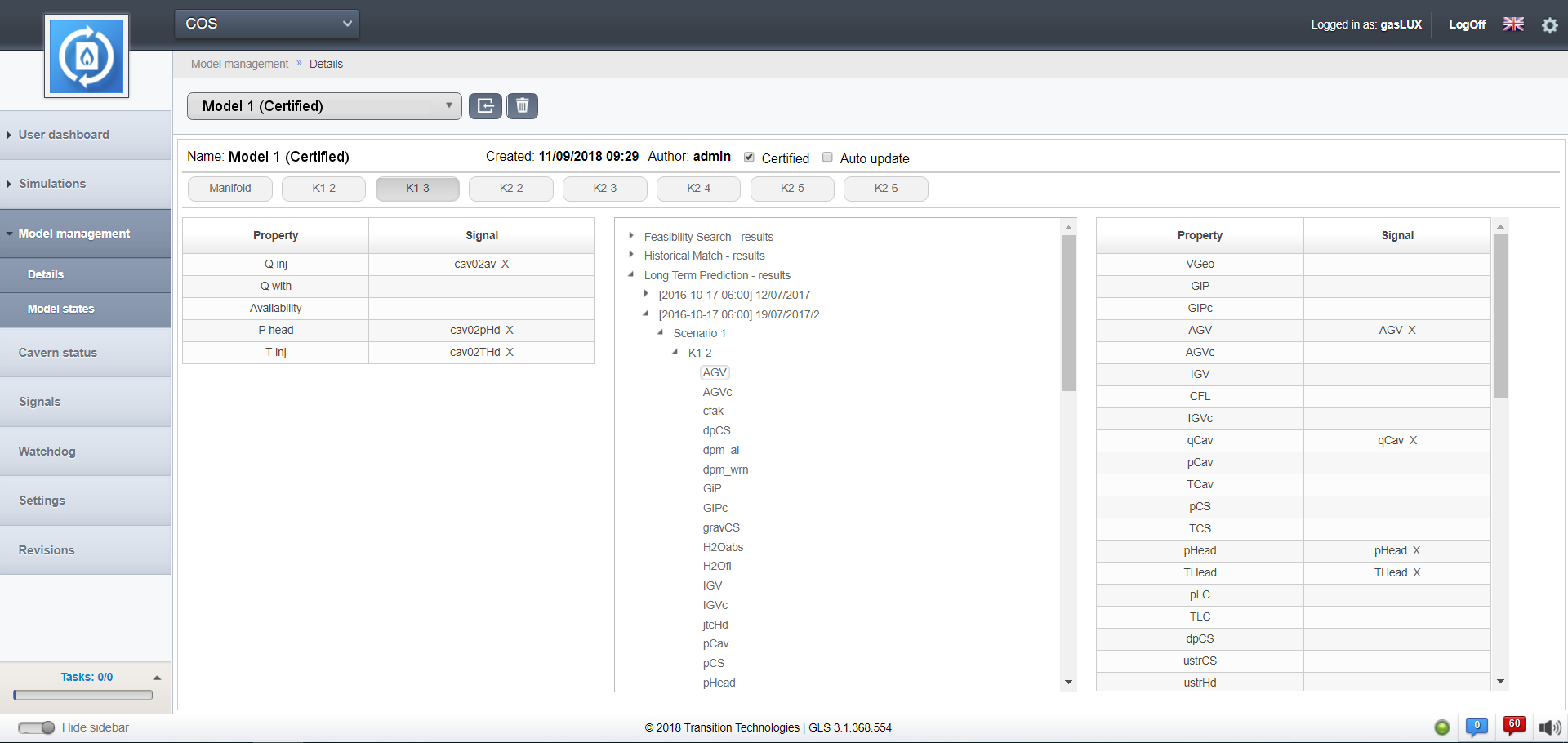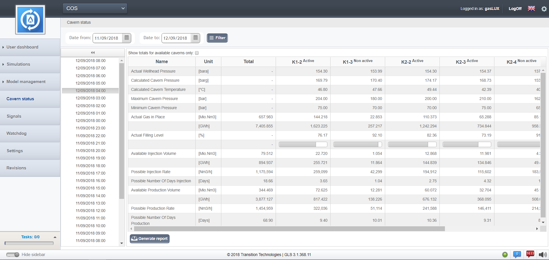 COS dostarcza operatorowi magazynu gazu dokładne i praktyczne informacje dotyczące aktualnej dostępności, stanu i symulowanego przyszłego zachowania kawern. COS wspiera procesy techniczne, ale również dostarcza informacje wspomagające procesy biznesowe.